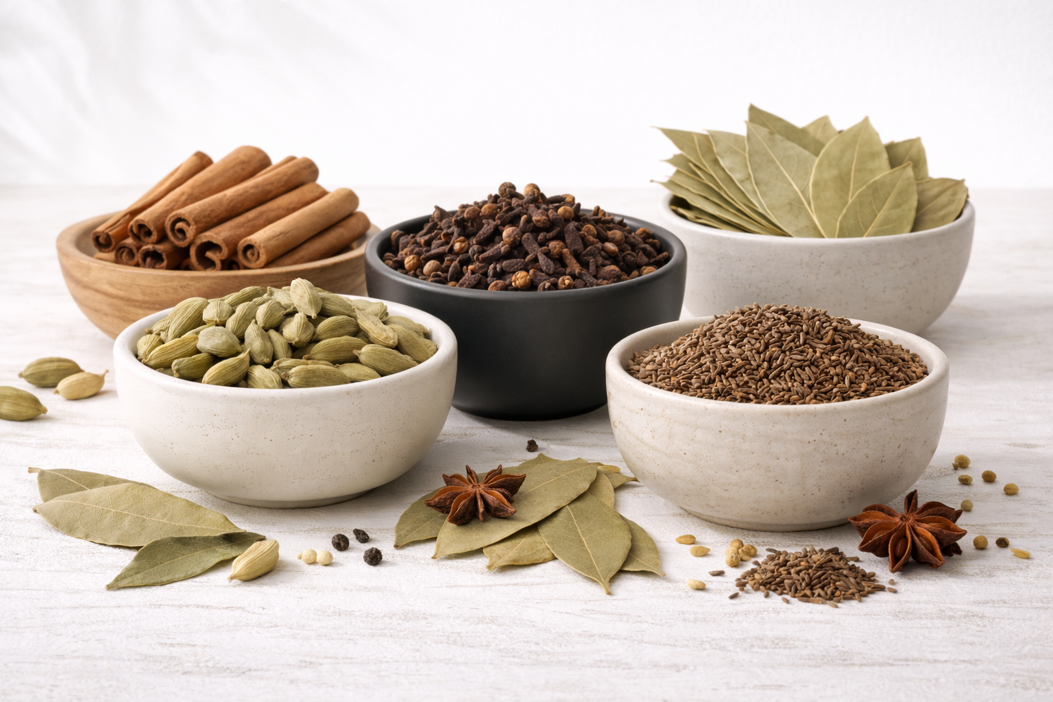 All the whole spices you need for the perfect Biryani: Cardamom, Cloves, Cinnamon, Bay Leaf, Star Anise, and Shahi Jeera.